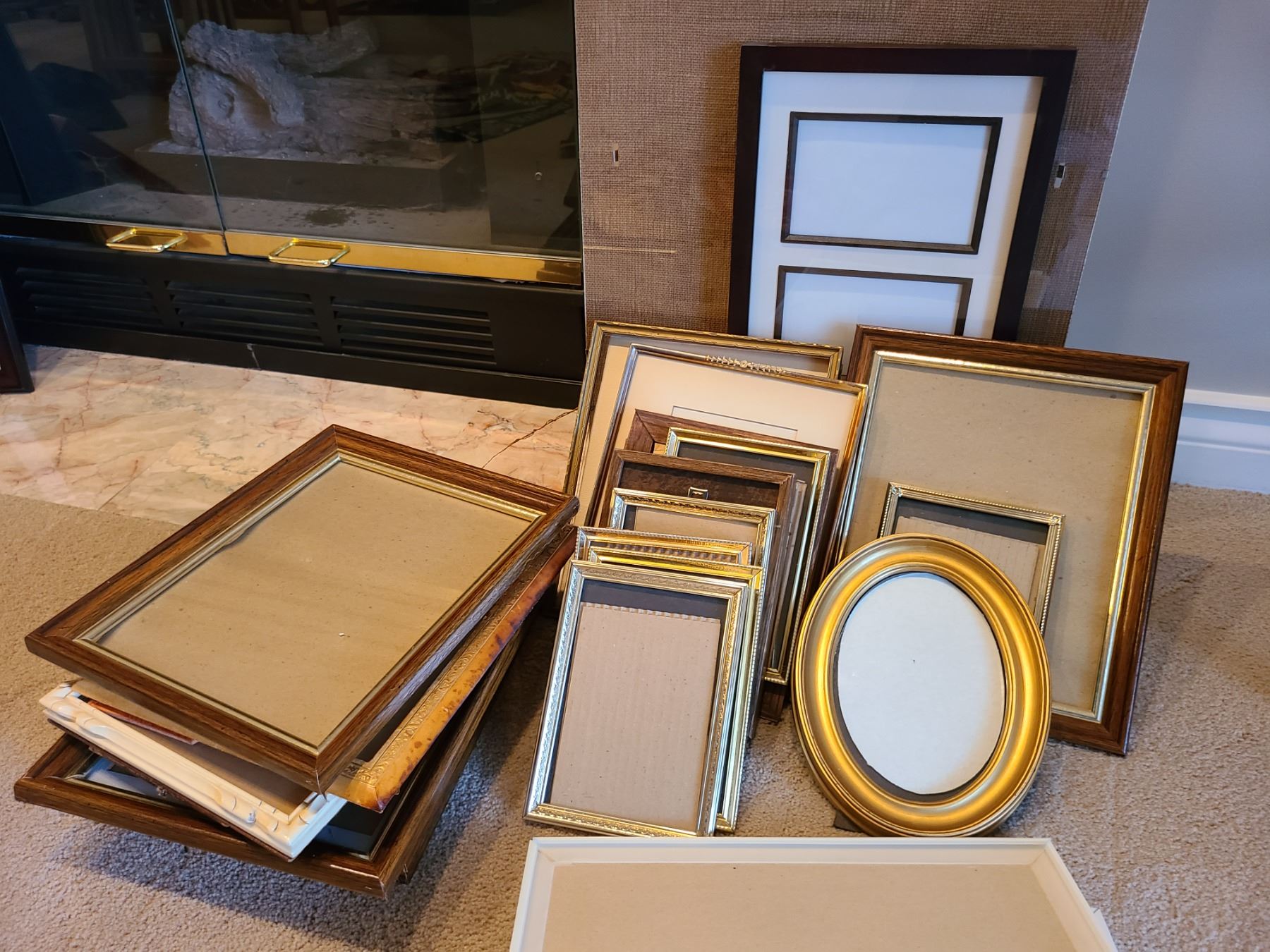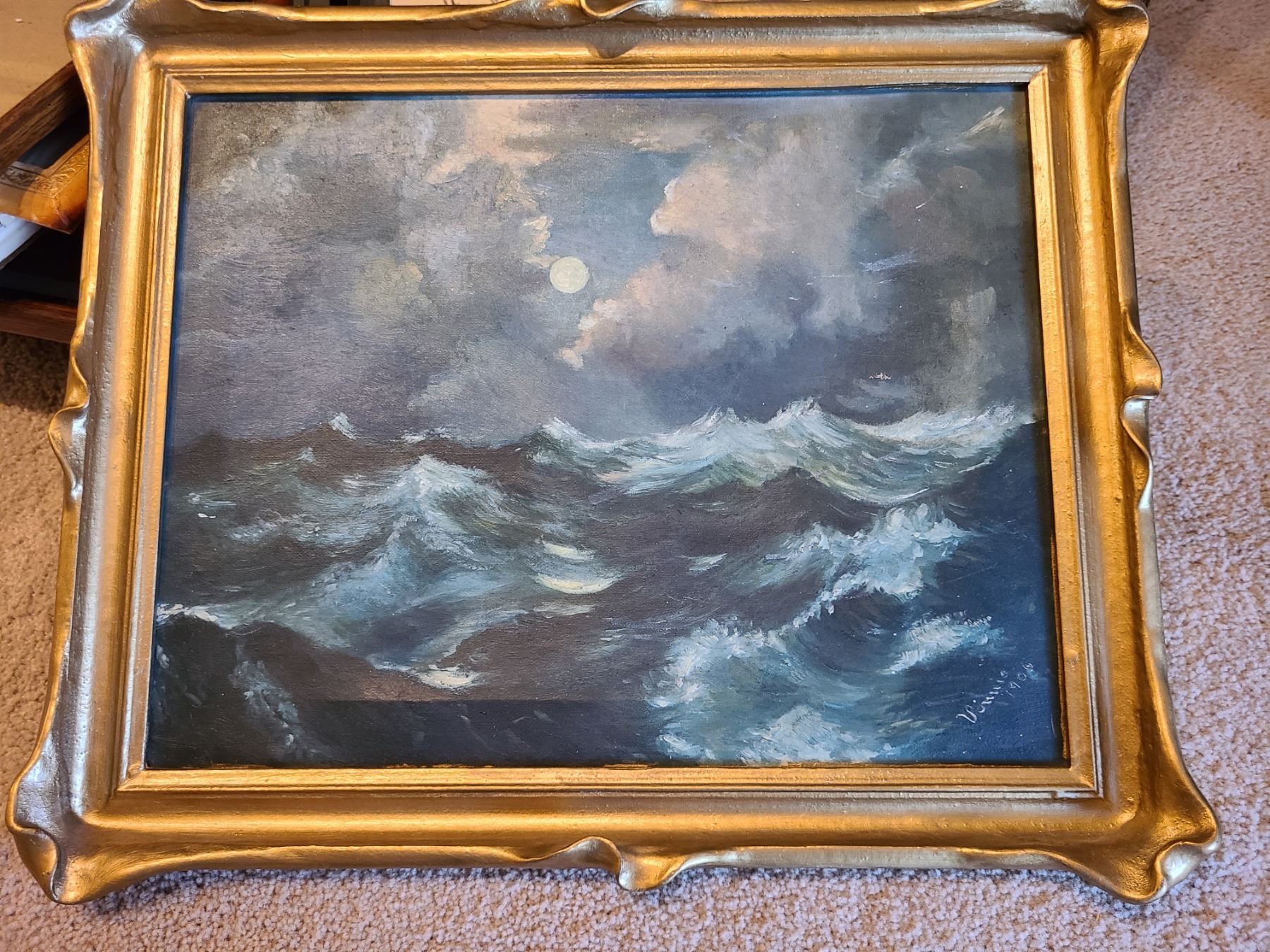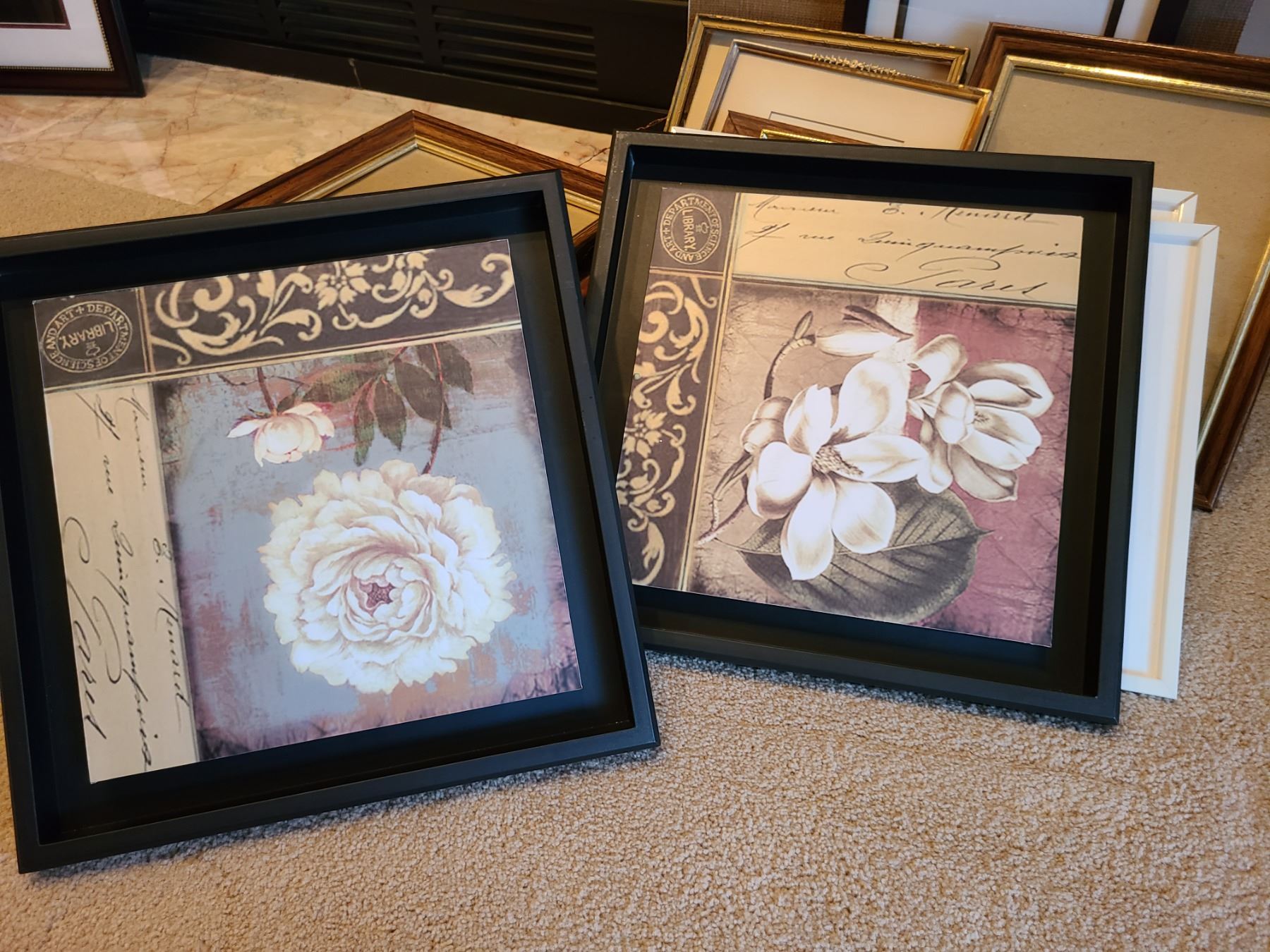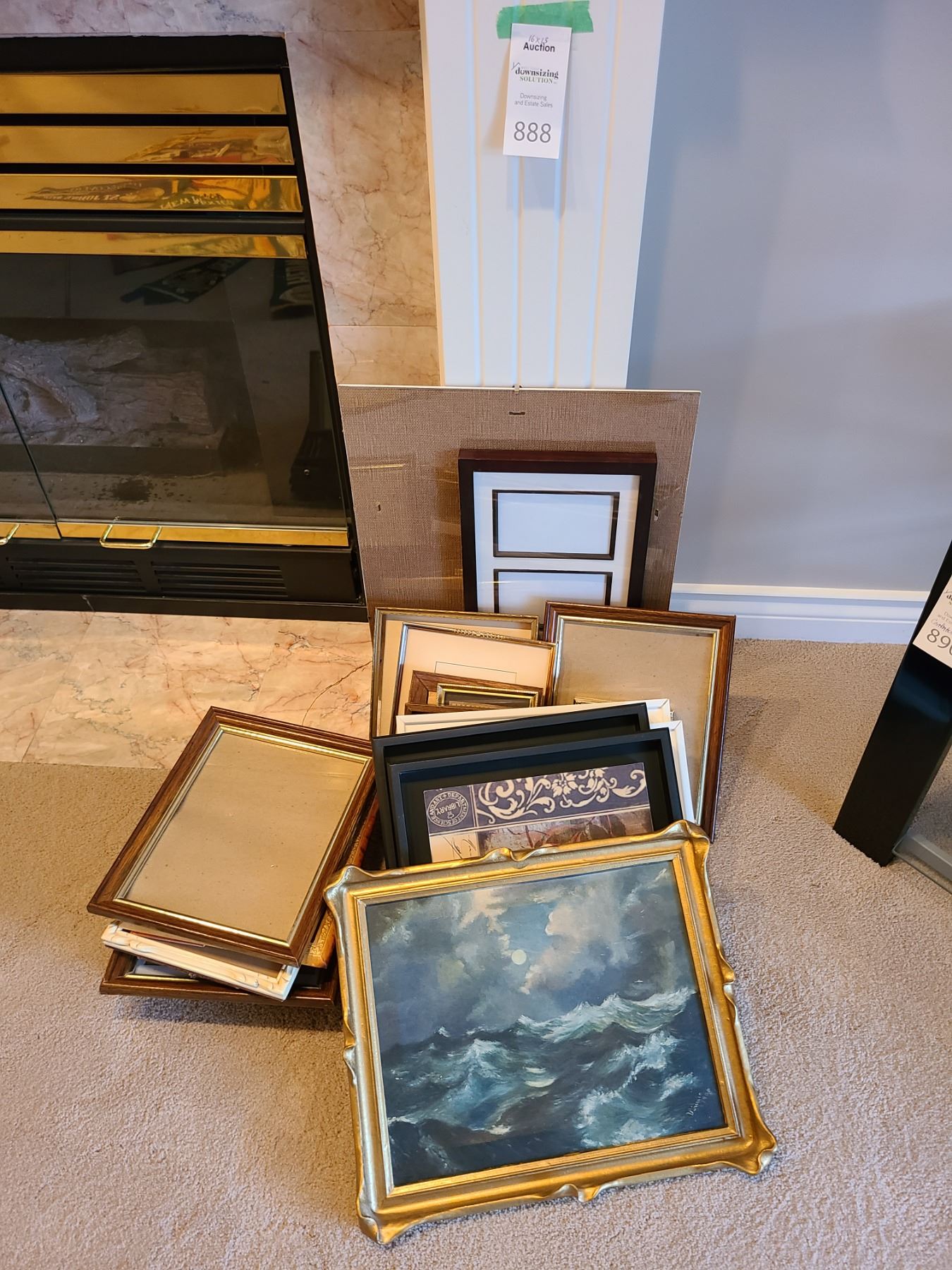 Lot includes glass picture frames, flower pictures, and signed ocean piece 16x13. Bring boxes. Pickup 9 am.