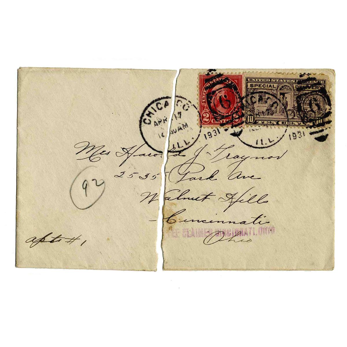 Handwritten envelope by 3rd baseman Hall of Famer Harold ''Pie'' Traynor, addressed to his wife at their Cincinnati home. Signed, in that Traynor addresses the envelope to ''Mrs. Harold J. Traynor''. Envelope is postmarked 17 April 1931 from Chicago at the Parkway Hotel and measures 5.5'' x 3.5''. Center tear archivally repaired and overall light wear. Postmark affects the top of ''Harold'' in his signature. Very good condition.