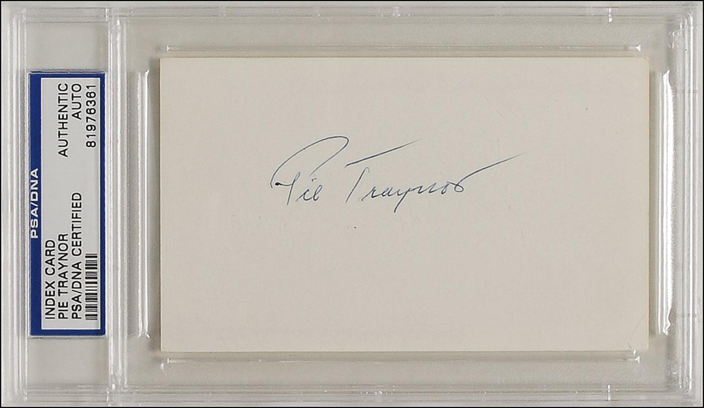 Blue ballpoint signature, “Pie Traynor”, on an off-white 5 x 3 card. Encapsulated in a plastic PSA/DNA authentication holder. In fine condition.