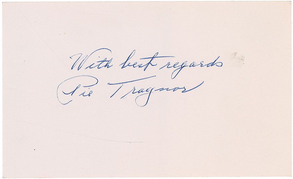 Superior third baseman and Hall of Famer (1898–1972). Ballpoint signature, “With best regards, Pie Traynor,” on an off-white 5 x 3 card. In fine condition, with a light spot of soiling next to sentiment.