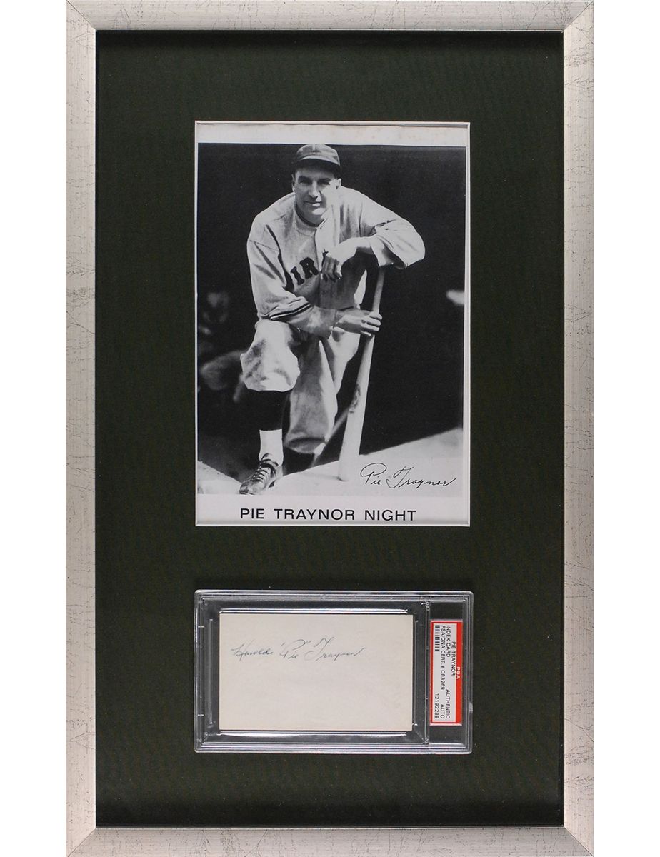 Ballpoint signature, “Harold ‘Pie’ Traynor,” on an off-white 5 x 3 card encapsulated in a plastic PSA/DNA authentication holder. Matted and framed with a photo of Traynor in the dugout, bearing a pre-printed signature, to an overall size of 13.75 x 22. In very fine condition.