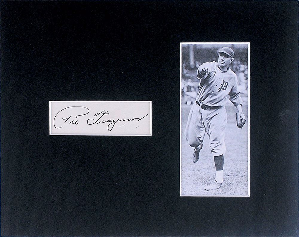 Ink signature, "Pie Traynor," on an off-white 3.25 x 1 card. Matted with a photo of the Pittsburgh Pirates third baseman to an overall size of 10 x 8. In fine condition, with a surface mark below surname.