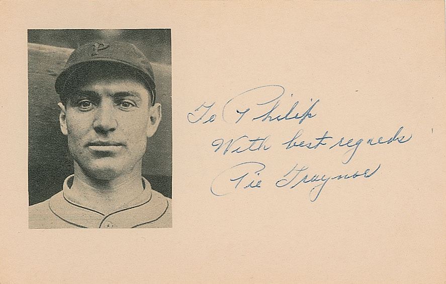 Vintage ballpoint signature and inscription, "To Philip, With best regards, Pie Traynor,” on an off-white 5.75 x 3.75 card bearing an affixed portrait. In very fine condition.