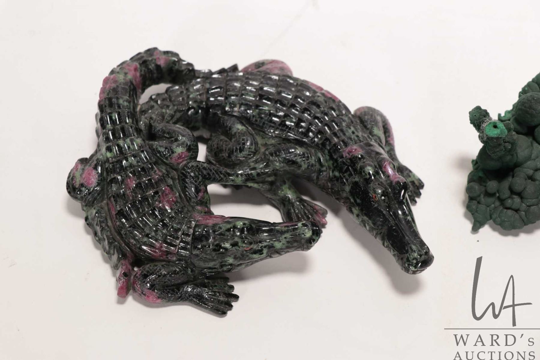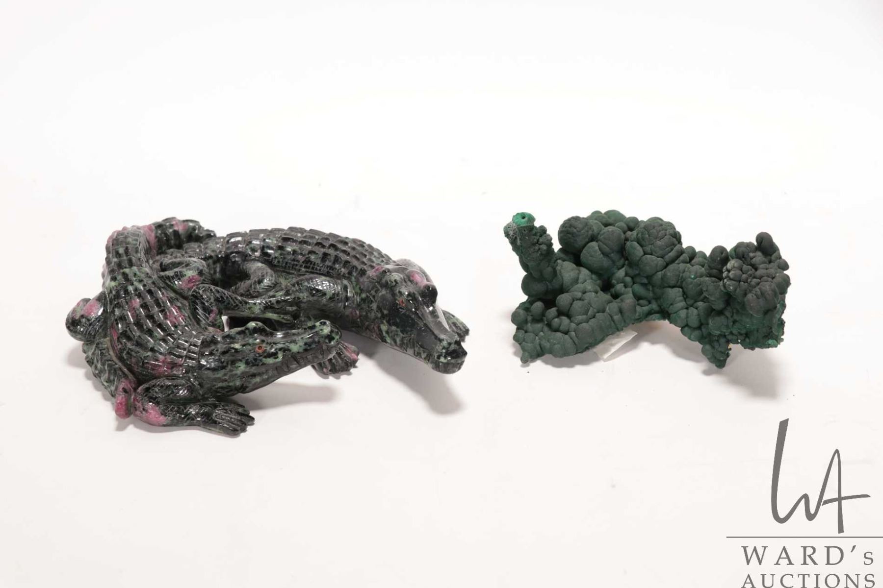 Piece of natural botryoidal malachite and a hand carved gemstone crystal in the shape of two crocodiles, approximately 7" in diameter