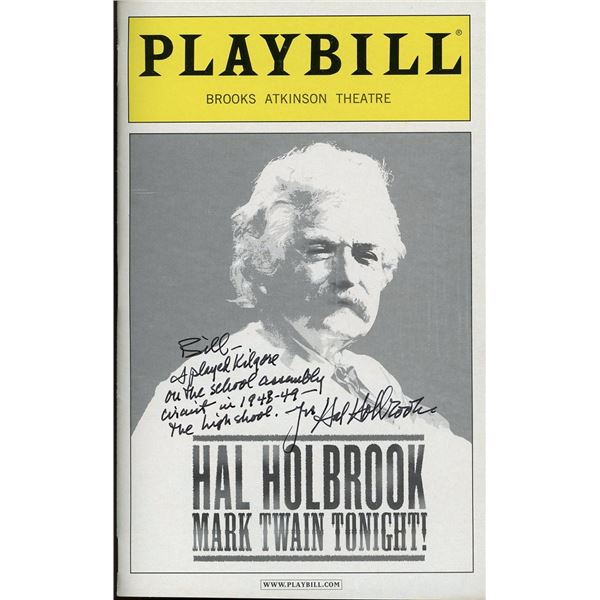 Playbill for the production Mark Twain Tonight inscribed and signed by Hal Holbrook. All items come with a COA and guarantee for the life of the piece