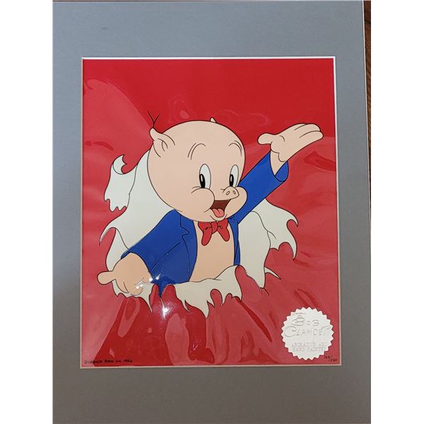 Original Bob Clampett hand-painted animation art cel featuring Porky Pig. The 1986 Warner Bros. licensed cel is numbered 163 of 250. It is matted and