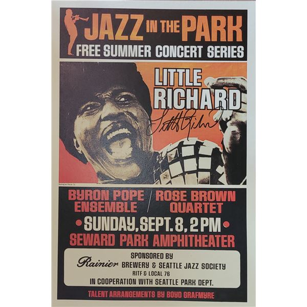 Original Jazz in the Park window card sized concert poster featuring and signed by Little Richard. All items come with a COA and guarantee for the lif