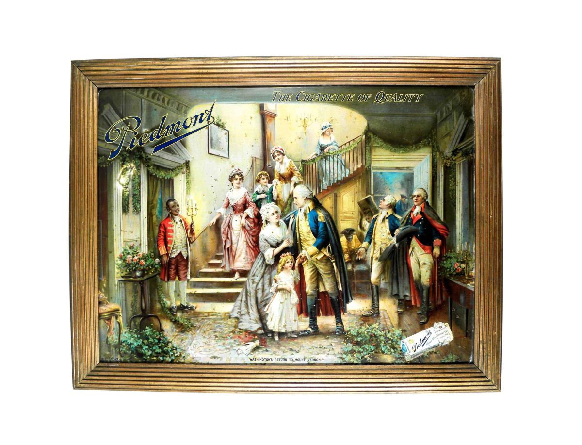 Piedmont Cigarette Tin Sign. Entitled, "Washington's return to Mt. Vernon". Percy Moran, artist, 1916. Rust specs throughout otherwise good condition. 30 X 24 inches overall.
