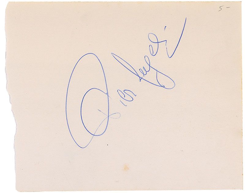 Italian-born actress (1932–1971), romantically linked to James Dean, who later married entertainer Vic Damone. Angeli died of a barbiturate overdose at the age of 39. Ballpoint signature, “Pier Angeli,” on an off-white 5.25 x 4.5 album page. A rough left edge and a small pencil notation to top right, otherwise fine condition.