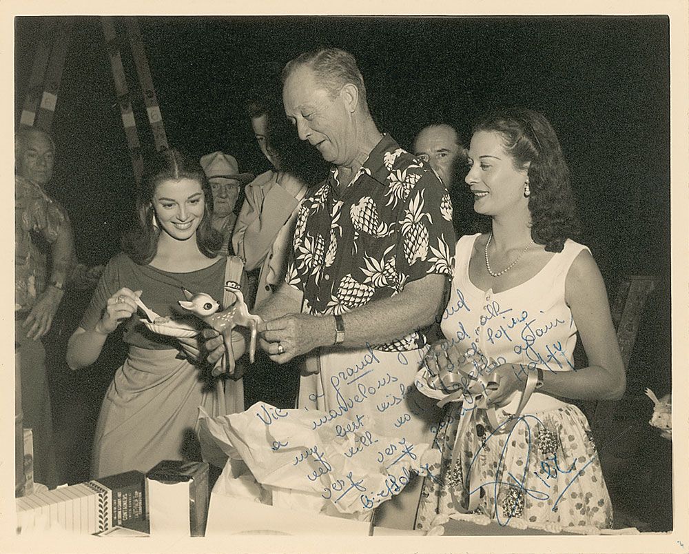 Vintage matte-finish 10 x 8 candid photo of “Vic” receiving a deer as a gift from Angeli, signed and inscribed in blue ink, “Vic, a proud guy and a marvelous friend, all my best wishes and hopes we will work together again very very soon! Happy birthday, Pier.” In fine condition. Originates from the personal collection of Victor Johnson, who worked as a gaffer at Warner Bros. for over forty years.