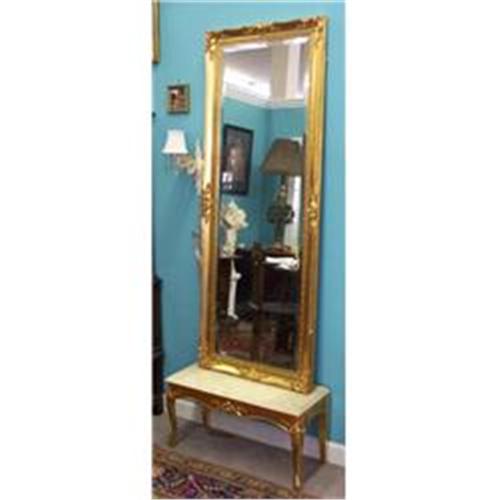 <table width="100%" border="0" cellspacing="0" cellpadding="4"><tr><td><em> </em></td></tr><tr> <td width="100%"> This beautiful modern pier mirror with stand features a beveled mirror in a gilt wooden frame done in a classic design. The mirror, which has hooks for wall hanging, also comes with a matching stand, also finished in gilt wood with a faux marble top on which the mirror may stand. This tall, elegant piece would add to any room of the house, and is in very good condition--there are only some minor, barely noticeable scratches in the gold finish on the mirror's frame, and other than this, the piece is in excellent shape. Please note that the dimensions given are for the mirror only--the stand which comes with the mirror measures 15.5 inches tall, 29.5 inches wide, and 12.5 inches deep. Shipping costs will be calculated at the time of sale (as costs will vary depending on the location of the buyer) at the best possible rate. </td></tr><tr> <td> </td></tr><tr> <td>Reference #: RAF3664</td></tr><tr><td>Condition:very good</td></tr><tr><td>Year:20th Cent.</td></tr><tr><td>Height:65.5</td></tr><tr><td>Depth:2</td></tr><tr><td>Width:26</td></tr><tr><td>Title:Pier Mirror with Gilded Frame and Stand</td></tr><tr><td>Materials:wood, mirror, faux marble</td></tr><tr><td>Location:Marion, SC</td></tr></table>