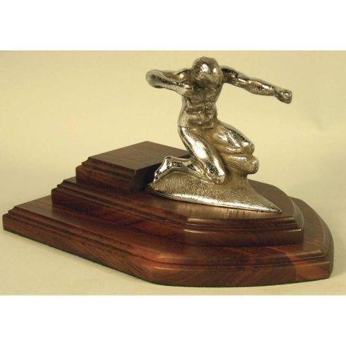 Hood Ornament Mascot, Pierce Arrow Archer, marked Tiereur d Arc, mounted on custom made walnut base. Some corrosive spots throughout, missing arrow otherwise good condition. 5 inches tall.