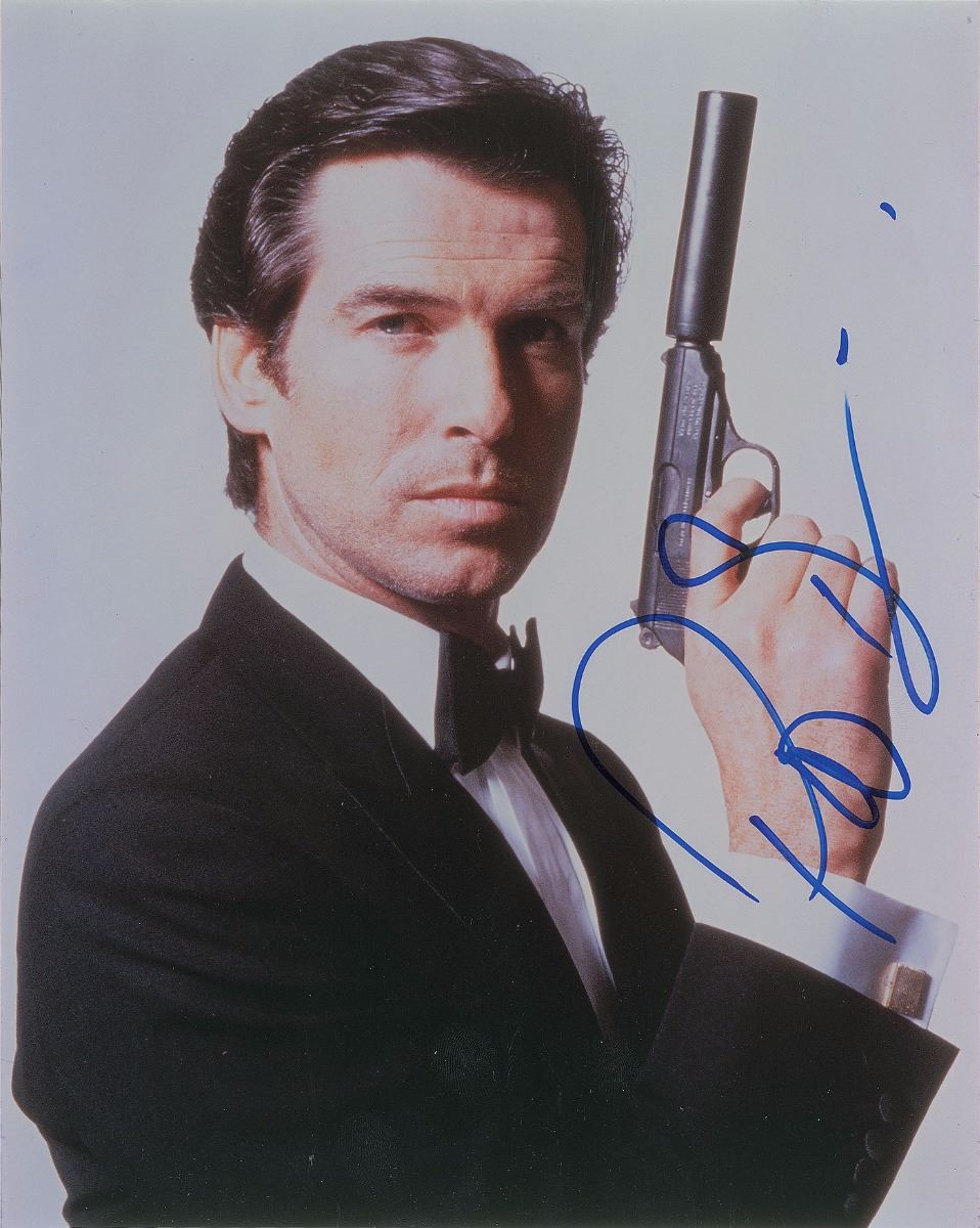 Exemplary color satin-finish 8 x 10 photo of Brosnan as the modish secret agent James Bond, signed in blue felt tip. In very fine condition.