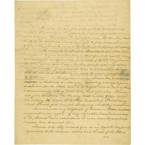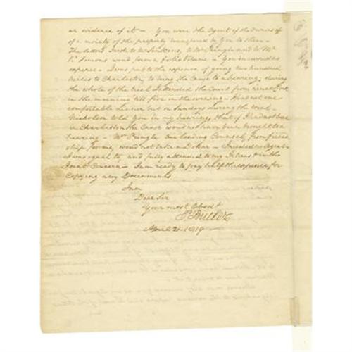 <B>Pierce Butler Autograph Letter Signed</B></I> “<I>P. Butler,</B></I>” two pages, 8” x 9.75”, front and verso. Philadelphia , April 21, 1819. Integral leaf addressed by Butler to “<I>Robert E. Griffith Esqr.</B></I>” The integral leaf is inlaid to an 8” x 13.25” sheet. In part, “<I>I demanded payment as my right.; if any objection had been raised to it, I would have considerd it as an insult; and have known how to resent it. I never once Sir, viewed you as my agent - our joint signatures to the various papers and to most of the letters are evidence of it…You incurred no expence. I was put to the expence of going two hundred miles to Charlotte, to bring the cause to a hearing; during the whole of the trial I attended the Court from nine o'clock in the morning 'till five in the evening - I had not one comfortable dinner but on Sundays during the trial…I needed no agent - I was equal to, and fully attended to my interest in the joint concern. I am ready to pay half of the expence for copying any documents.</B></I>” Pierce Butler, delegate to the Continental Congress, signed the U.S. Constitution in 1787 and, two years later, was elected one of South Carolina's first two U.S. Senators (1789-1796, 1802-1804). He was 74 years old when he made his 200 mile trip from Charleston to Charlotte and then wrote this letter. Fine condition.<BR><BR><b>Shipping:</b> Flat Material, Small (<a target="_blank" href="http://www.heritageauctions.com/common/shipping.php">view shipping information</a>)