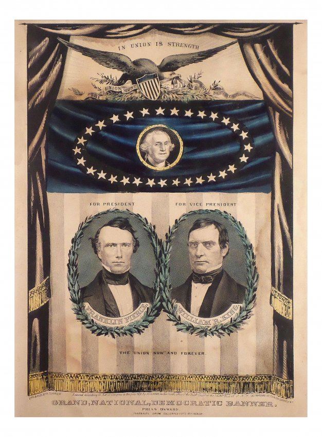 Hand-colored lithograph containing jugate portraits of Franklin Pierce and William R. King below a depiction of George Washington surround by 31 stars.  Top features large vignette with eagle below caption "In Union Is Strength" and holds a banner in its beak inscribed "Union Must And Will Be Preserved".  Titled at bottom "Grand, National, Democratic Banner, \ Press Onward".  Printed by Nathaniel Currier, 1852. [Image: 12" x 8-1/2"; Sheet 14" x 10-1/8"; Frame 16-1/2 x 12-1/2"].  Age-toning, water stains, tipped to mount with masking tape on extreme edges at bottom corners and left side.