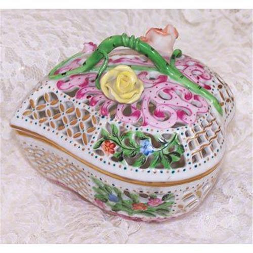 <tr><td>Title:Pierced Heart Box Applied Flowers Gold HEREND </td></tr>