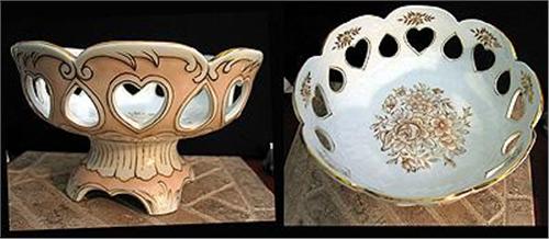 Pierced porcelain fruit bowl, unsigned but marked 23/302, rose and heart motif. Stands 6" tall x 9 3/4" across. No chips or cracks