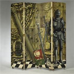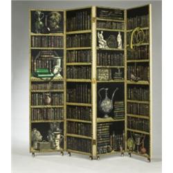 Piero Fornasetti Biblioteca folding screen Fornasetti Milano Italy, c. 1950s hand painted wood panels 80"w x 81.25"d x 2"h Signed and inscribed: [Made in Italy].