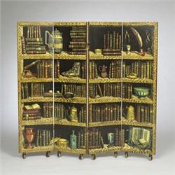 Piero Fornasetti folding screen Fornasetti Milano Italy, c.1958 hand painted and transfer printed wood, brass 56"w x 1.5"d x 54"h Fine example depicting a scholar's library and mandolins with extensive hand painting.