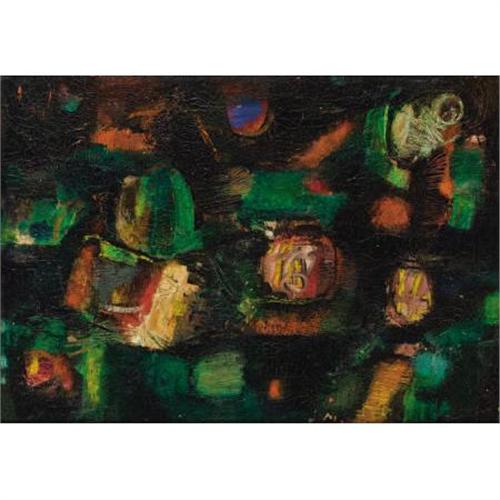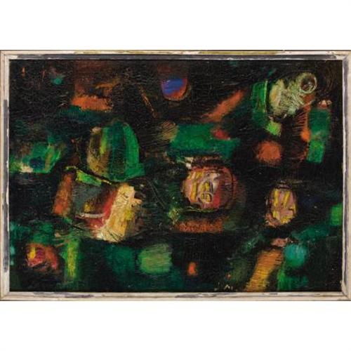 <B>PIERO RUGGERI (Italian, b. 1930)</B></I><BR><I>Portuale di Notte</B></I>, 1956<BR>Oil on canvas<BR>27-1/2 x 39-1/2 inches (69.9 x 100.3 cm)<BR>Signed lower right: <I>Ruggeri</B></I><BR>Signed, dated and titled verso: <I>Ruggeri Piero/ Portuale di Notte 1956</B></I><BR> <BR>PROVENANCE:<BR>Estate of the artist;<BR>Gallery Torino (torn label verso);<BR>Madison Avenue Gallery, New York, New York<BR><BR>EXHIBITED:<BR>XXVIII Esposizione Biennale Internazionale d'Arte, Venezia, 1956, no. 773 (label verso);<BR>NY Circulating Library of Paintings Inc. (label verso)<BR><BR>
