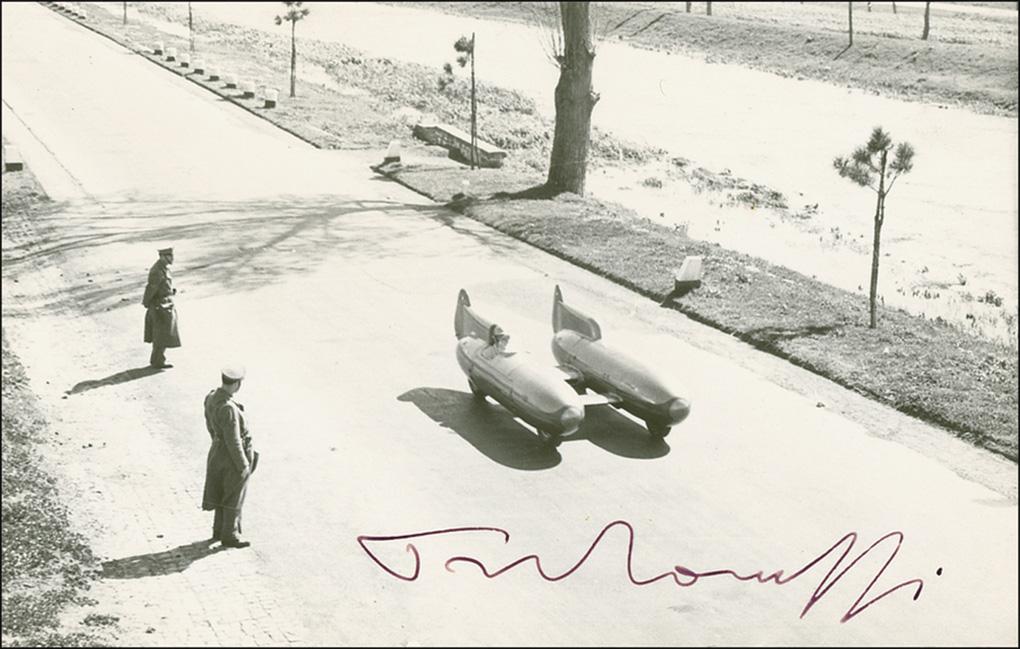 Italian race car driver (1906-1988). Vintage 5.5 x 3.5 postcard photo of Taruffi in his self-developed rocket car, signed in fountain pen. In fine condition, with some scattered light surface impressions. In August, 1952, Taruffi protected a racing car design under patent 2,608,264. The patent had three torpedo-shaped parallel bodies joined together.