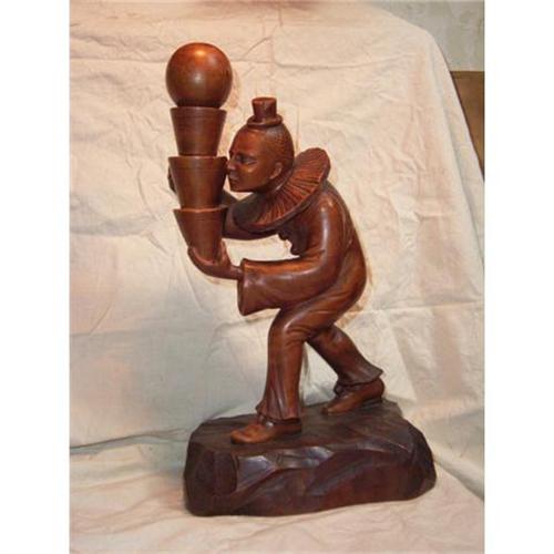 He is holding some things to juglle with.and on top of that a wooden ball.