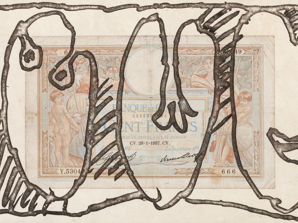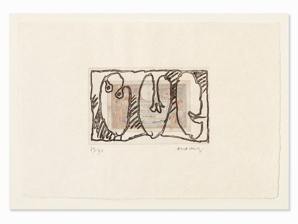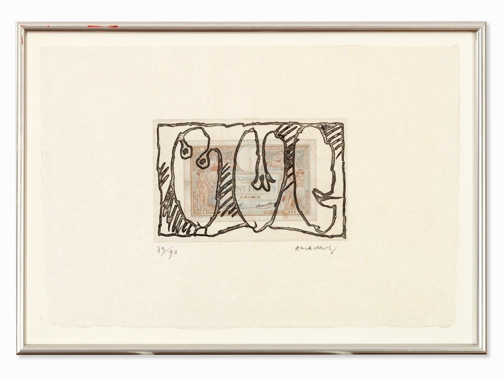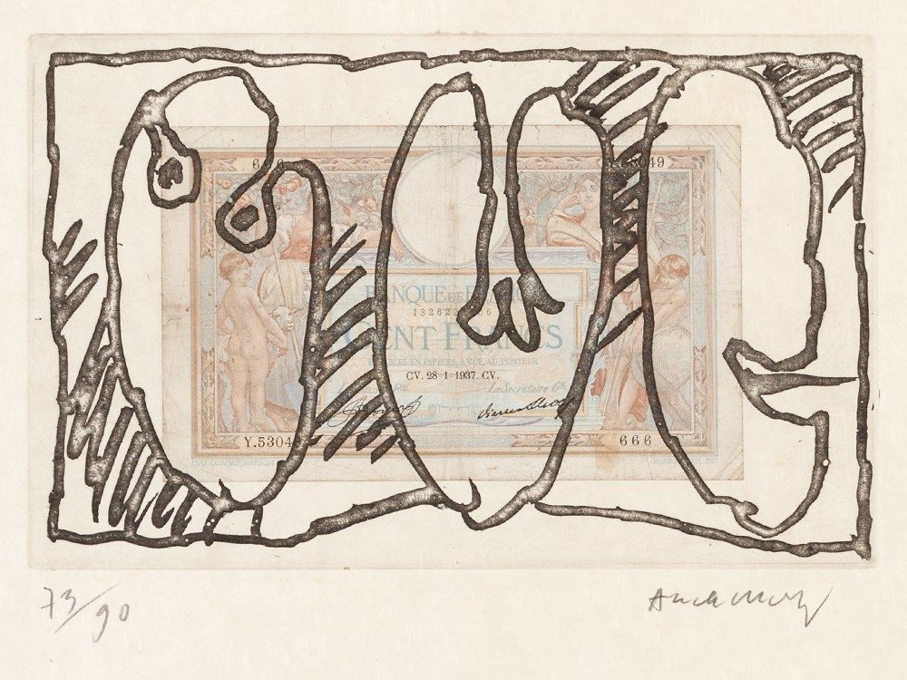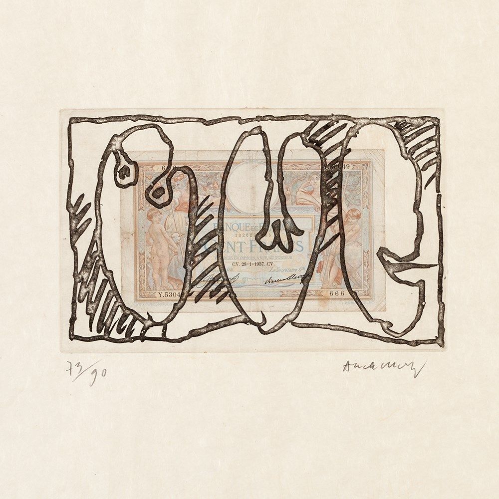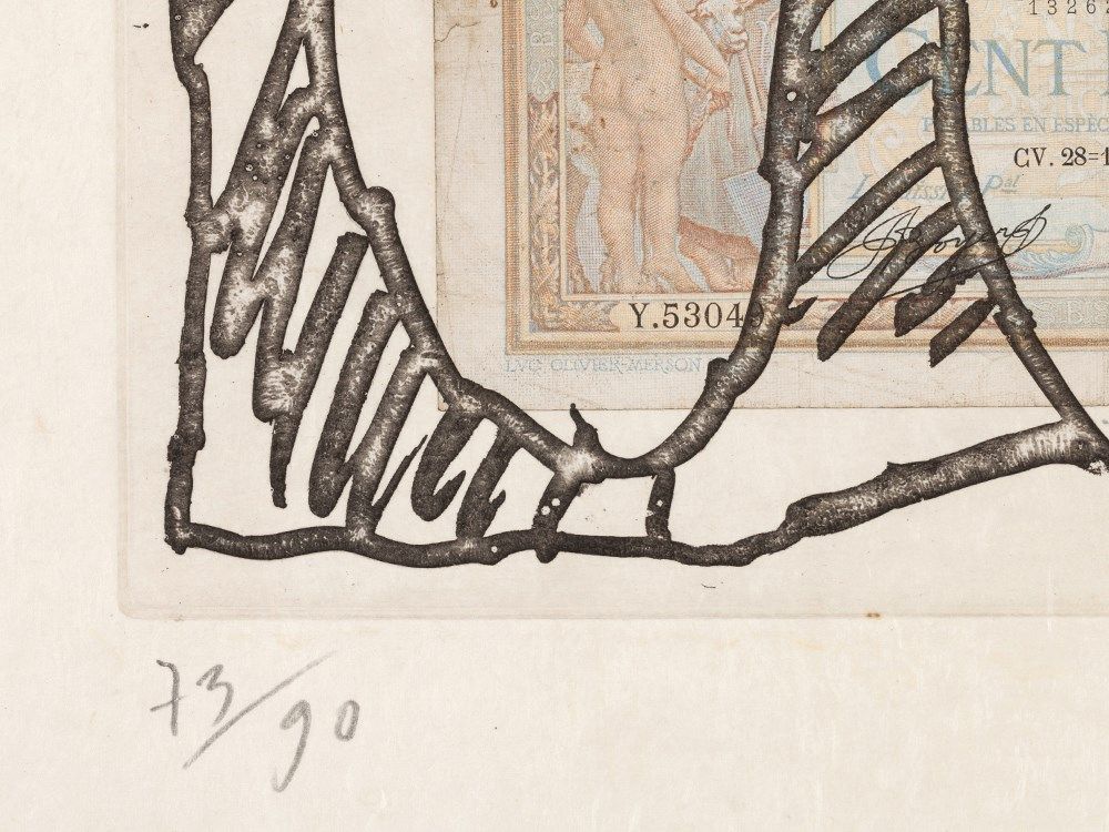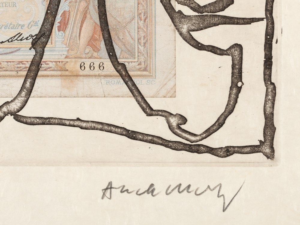 In this print, presumably from the 1980s, the etched drawing is printed on a ten-franc banknote, which is rolled on the Japon nacré. The drawing of the etching is reminiscent of Eastern calligraphy that influenced Alechinsky’s work.