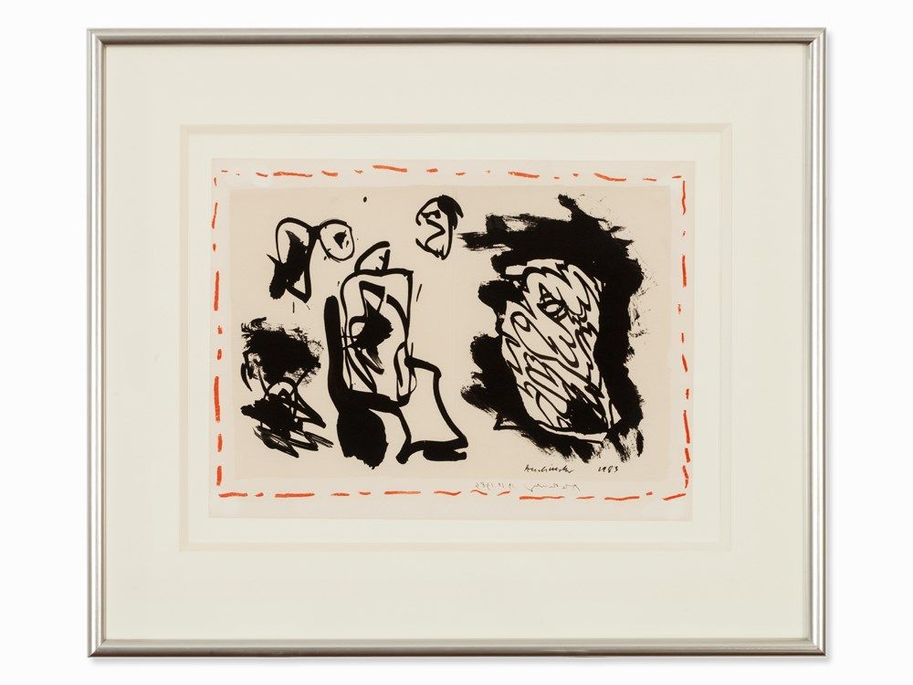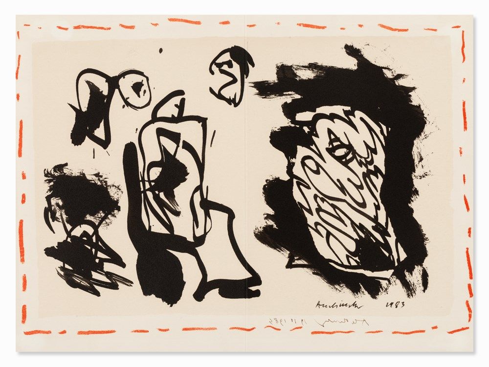 This lithograph in colors from 1983 shows on a light beige ground abstract drawings appearing calligraphic. A red broken line frames the composition and gives a charming accent color.