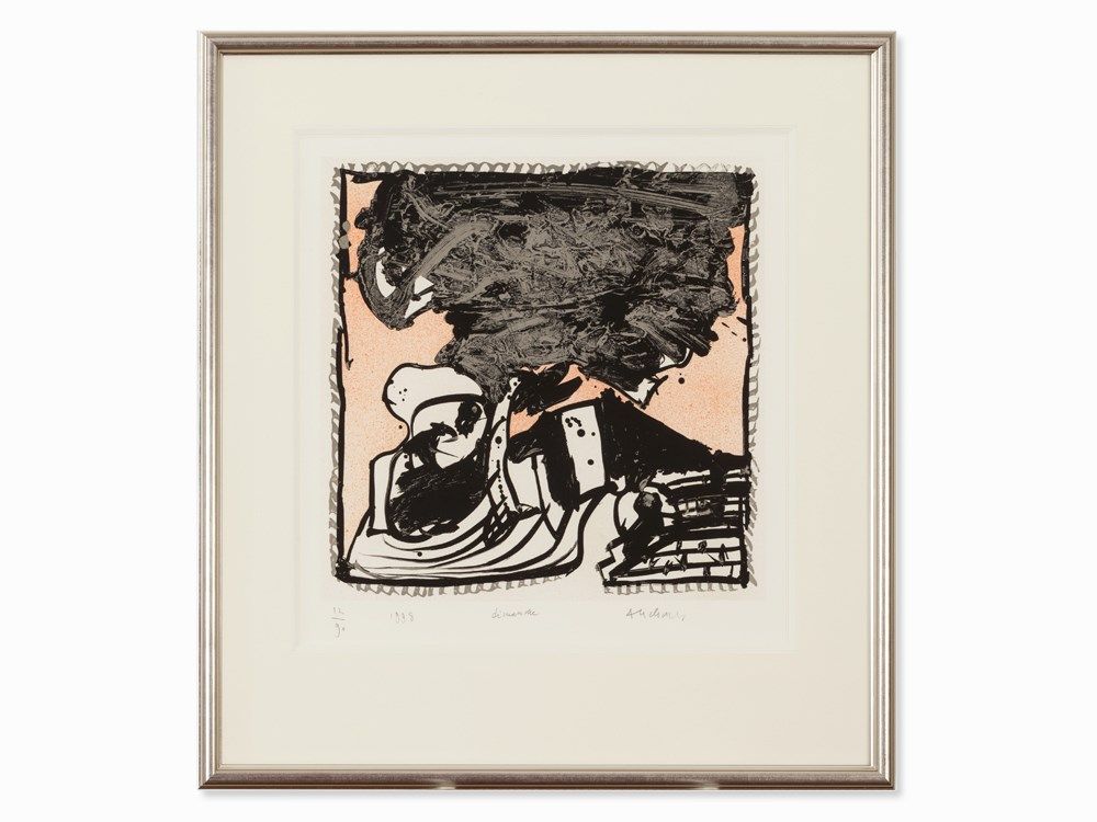 The lithograph in colors is signed lower right in pencil ‘Alechinsky’, lower left numbered and dated in pencil ‘12/90 1998’ and lower center titled in pencil ‘dimanche’. There is a slight crease in the upper right corner. The sheet is reversibly mounted in a mat at the reverse upper edge. The frame indicates slight signs of wear. The image measures 46.1 x 47 cm, the sheet 60 x 54 cm. The framed dimensions are 78.8 x 73.3 cm.