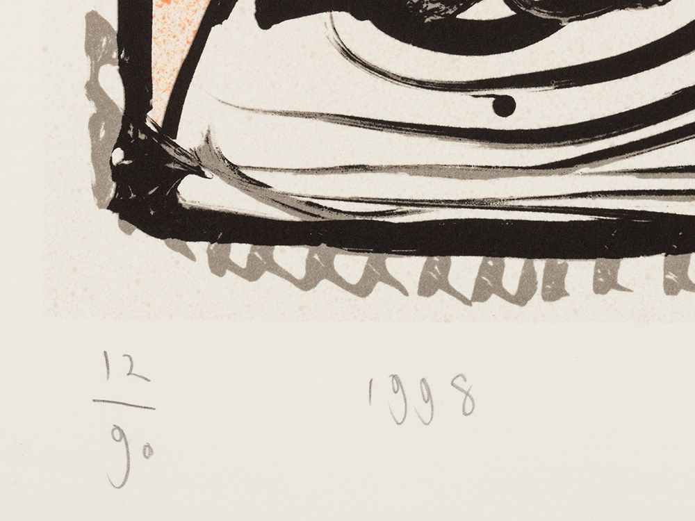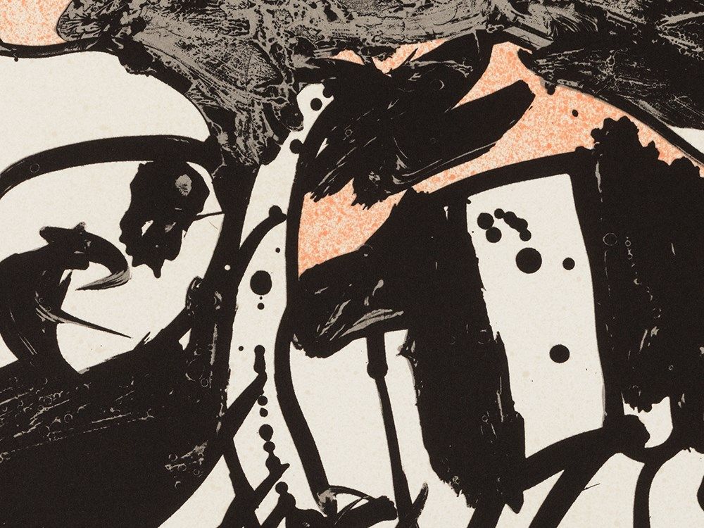 The lithograph in colors by the Belgian artist from 1998 shows an abstract composition of line formations and structured surfaces. The coloring is limited to harmonious-restrained black, gray and salmon pink. The sheet was created in Atelier Clot, Paris.