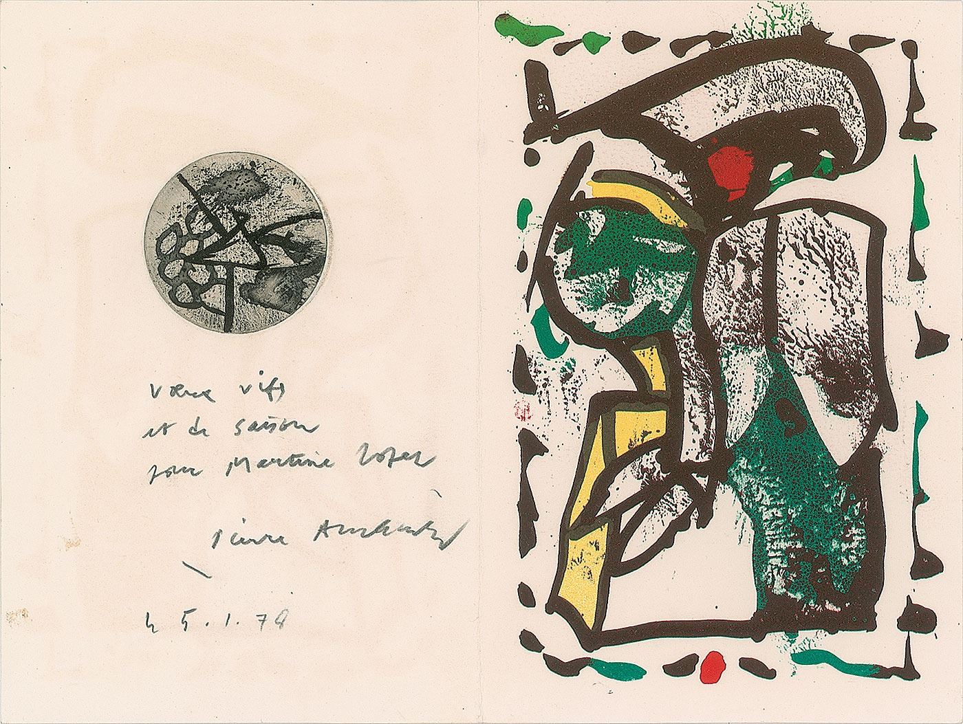 Belgian artist (born 1927) whose work is related to tachisme, abstract expressionism, and lyrical abstraction. Untranslated ANS in French, written in pencil on the reverse of a greeting card featuring one of his paintings, measures 11.25 x 8.5 open, January 25, 1978. In fine condition, with some light toning.
