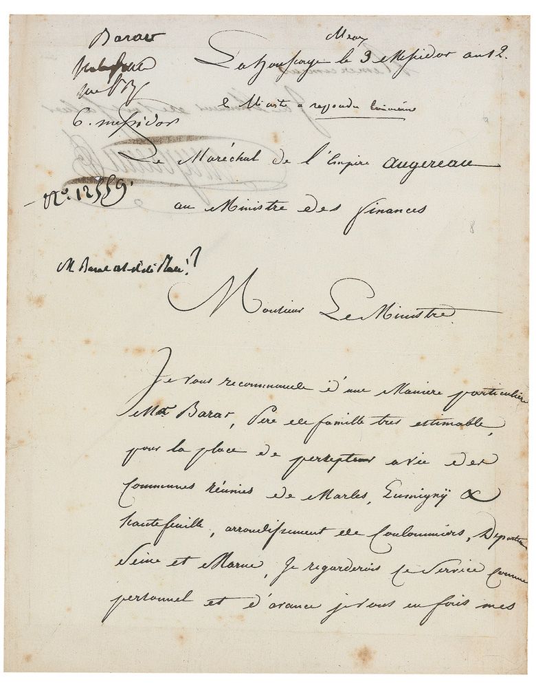 Marshal of France and Duke of Castiglione (1757–1816). ALS in French, signed “Augereau,” one page both sides, 8.25 x 10.25, no date. Untranslated correspondence to his Minister of Finances. In very good condition, tipped into a slightly larger page with wrinkling and mild toning and soiling.