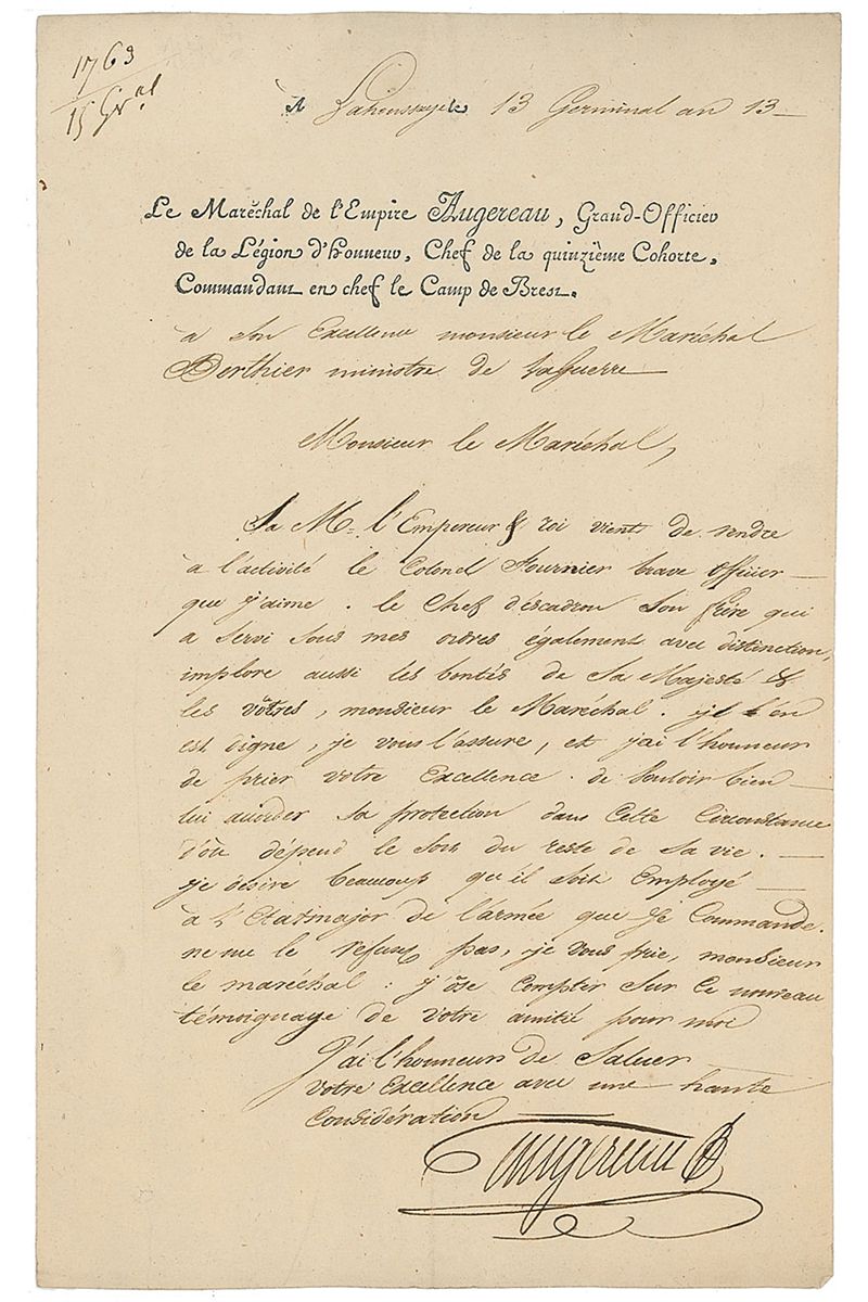 Marshal of France and Duke of Castiglione (1757–1816). LS in French, signed “Augereau,” one page, 7.75 x 12.5, April 3, 1805. Letter to Marshal Berthier, Minister of War. In part (translated): “H.M. the Emperor has just restored to active service Col. Fournier, a fine officer of whom I’m very fond. His brother, the Squadron Chief who also served with distinction under my orders implores the good offices of His Majesty and of you, Marshal…grant him the protection…on which the rest of his life depends. I want very much to see him attached to the General Staff of the Army which I command. Don’t refuse me, I beseech you, Marshal. I make bold to count on this new token of your friendship for me.” In fine condition, with central horizontal and vertical folds.