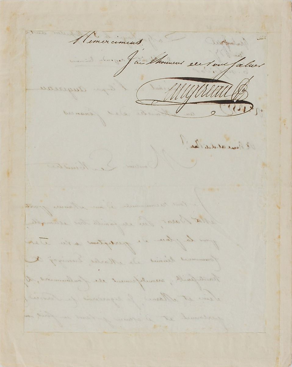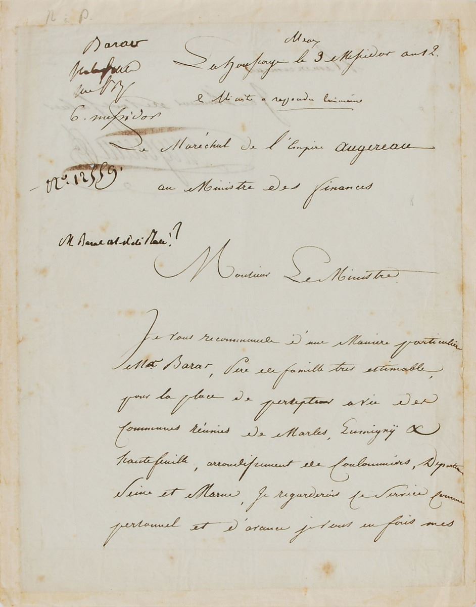 Marshal of France and duke of Castiglione (1757–1816) who served with distinction under Napoleon during the French Revolution. LS in French, signed “Augereau,” one page both sides, June 21, 1794. Untranslated letter to the minister of finances. Tipped into a slightly larger page and in very good to fine condition, with scattered foxing and show-through from writing to opposing sides.