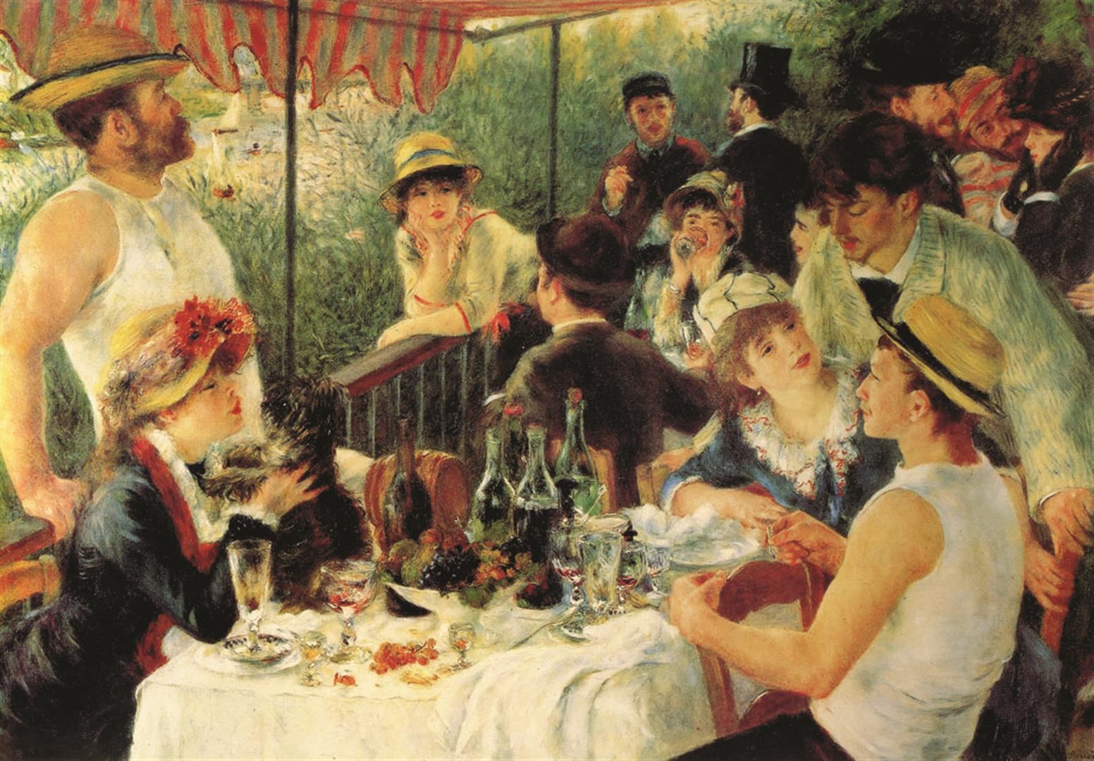Artist: Pierre-August Renoir - Title: Boating Party - Medium: Fine Art Giclee on Canvas - Image Size: Approximately 27.75 inches x 40 inches - Framed: Unframed on Unstretched Canvas - Renoir's paintings are notable for their vibrant light and saturated color, most often focusing on people in intimate and candid compositions. The female nude was one of his primary subjects. In characteristic Impressionist style, Renoir suggested the details of a scene through freely brushed touches of color, so that his figures softly fuse with one another and their surroundings.