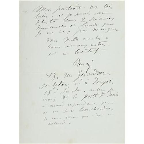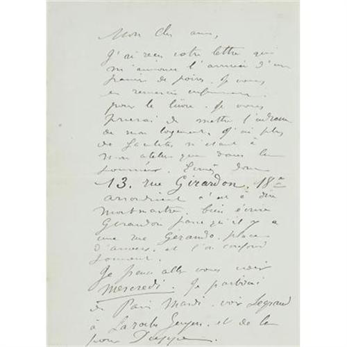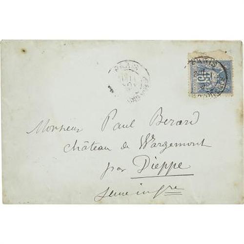 <B>Pierre-Auguste Renoir Autograph Letter Signed</B></I> "<I>Renoir</B></I>" in French, two pages, 4.75" x 6.5", conjoined leaves. 13 rue Girardon [Paris], no date but with original 5" x 3.5" envelope addressed by him to "<I>Paul Berard/Chateau de Wargemont/by Dieppe/Seine Infre,</B></I>" postmarked Paris, with a clear Dieppe postmark on verso, November 12, 1891. Banker Paul Berard was a patron and close friend of Renoir who had invited him to stay at his country estate in 1879. Among the Berard family portraits were some of Renoir's most celebrated studies of children, including all four children in "Les Enfants" (1881). In July 1890, Renoir had moved into number 13 rue Girardon, at the Chateau des Brouillards in Montmartre. In this letter, Renoir writes to Berard that he has received his letter and that he should write to him at "<I>13, rue Girardon, 18th district</B></I>." He writes that "<I>it is easier for me to be in my studio than in the daylight</B></I>" and tells him that "<I>My portrait is going very well...</B></I>" In a postscript, Renoir writes about the man his street was named after: "<I>Girardon sculptor born in Troyes 18th century, creator, I believe, of the Porte St. Denis...</B></I>" Sculptor Francois Girardon, born at Troyes in 1630, died in Paris in 1715. The 76-foot high Porte Saint-Denis was built by Francois Blondel in 1672 and decorated with sculptures by Girardon who was a favorite of King Louis XIV. His sculptures commemorated the King's military victories. The arch of the Porte Saint-Denis symbolically marked an entrance into 17th-century Paris at the site of an old tollgate. It served as the inspiration for the more famous Arc de Triomphe. Fine condition.<BR><BR><b>Shipping:</b> Flat Material, Small (<a target="_blank" href="http://www.heritageauctions.com/common/shipping.php">view shipping information</a>)