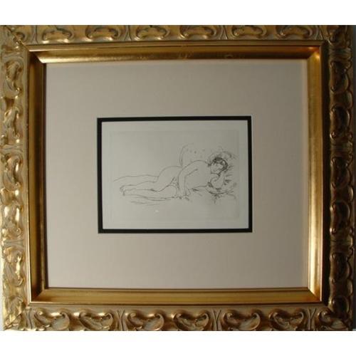 Pierre-Auguste Renoir restrike Etching, titled Reclining Nude, the full plate size is 7 " x 9 ". This piece is expensively framed in using a 3.5 solid wood good molding, acid free double matting and backing, the full frame size is 21.5 x 19.5. The posthumous Etching is in perfect condition, no tears, repairs, or stains. 1841-1919, French impressionist painter and sculptor, b. Limoges. Renoir went to work at the age of 13 in Paris as a decorator of factory-made porcelain, copying the works of Boucher. In 1862 he entered M. C. Gleyre's studio, where he formed lasting friendships with Bazille, Monet and Sisley. His early work reflected myriad influences including those of Courbet, Manet, Corot, Ingres and Delacroix. He began to earn his living with portraiture in the 1870s; an important work of this period was Madame Charpentier and her Children (1876; Metropolitan Mus.). Simultaneously he developed the ability to paint joyous, shimmering color and flickering light in outdoor scenes such as The Swing and the festive Moulin de la Galette (both: 1876; Louvre). Renoir traveled in Algeria and in Italy (1881-82), returning to Paris where a successful exhibition (1883) established him financially. He had gone beyond impressionism. His ecstatic sensuality, particularly in his opulent, generalized images of women, and his admiration of the Italian masters removed him from the primary impressionist concern: to imitate the effects of natural light. After a brief period, often termed harsh ...
