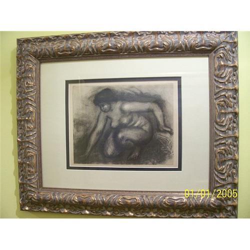 "Etude de Femme Nue" by Pierre-Auguste Renoir (1841-1919, French); ca. 1919; Medium: Helio-Engraving on Velin d'Arches Paper. Hand pulled from a Copper Place in Paris on December 15, 1919. Image Size" 7.5 x 10; Matting Size: 14 x 18; framed size: 17.5 x 21.5. The work is professionally matted with double acid free matting. It looks like an original lithograph, which gives it a most expensive appearance. The work is signed in the bottom center of the plate.
