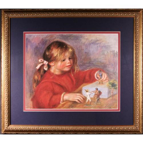 Renoir?s, ?Claude Renoir Jouant? is a splendid example of his snap shots of real life. Utilizing warm rich colors, the painting delightfully captures a young child at play. Renoir?s textured and luminous brushstrokes convey the innocence of the youthful moment. The vibrancy of the girl?s red sweater dutifully displays the excitement, wonder and imagination of child?s play.