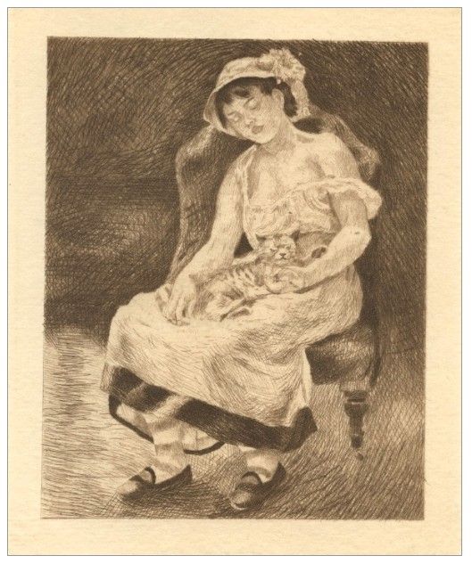 Pierre-Auguste Renoir etching "La femme au chat" - Medium: etching (after the painting). This beautiful piece was etched by Auguste Lauzet after Renoir, and published in Paris in 1892 by Chamerot et Renouard, for the very rare volume "L'Art Impressionniste", featuring etchings after important in the private collection of M. Durand-Ruel, which was at the time was one of the world's foremost collections of Impressionist art. This print is a fine impression printed on cream laid paper, with a platemark (not shown here in this photo) and good margins; the plate measures 6 x 4 3/4 inches - Professionally Framed & Matted - Comes With Certificate - -