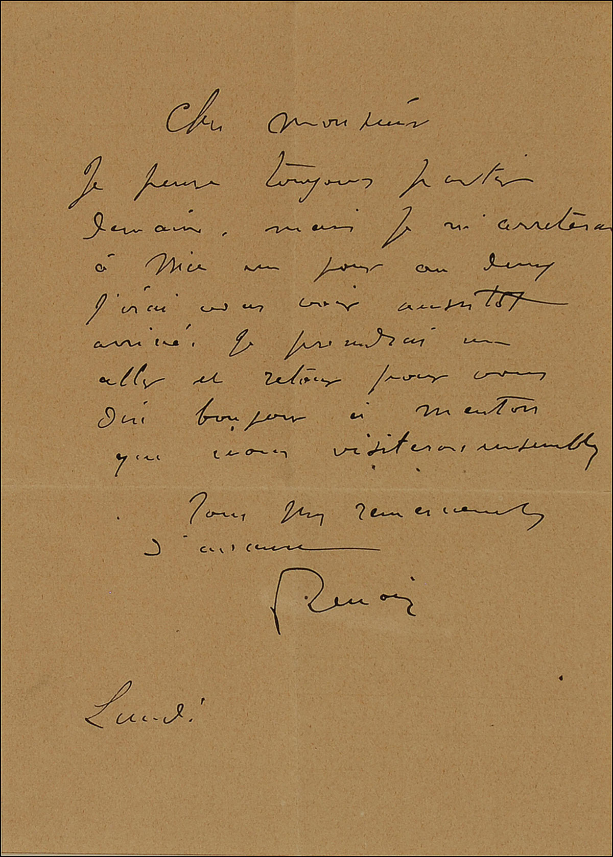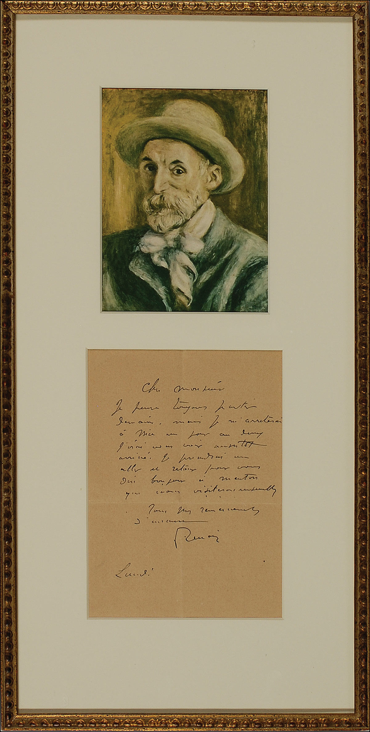 Widely admired French artist (1841–1919) who was one of the most visible and influential figures of the impressionist movement. ALS in French, signed “Renoir,” one page, 5 x 7, no date. Untranslated letter to an unidentified gentleman. Renoir discusses travel plans, leaving the next day. He will be in Nice for a day or two and will stop on his return in Menton to see the recipient of this letter. Framed with a color portrait of the artist to an overall size of 9.75 x 19.5. In fine condition, with intersecting folds, one through a single letter of signature, and a uniform shade of mild toning.