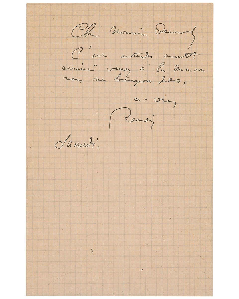 Uncommon ALS in French, signed “Renoir,” one lightly gridded page, 5.25 x 8.25, no date. Letter to “Mr. Deconchy.” In full (translated): “It is understood as soon as you arrive come to the house, we are not moving.” In fine condition, with subtle central vertical and horizontal folds, one passing through (but not affecting the crisp appearance of) the first letter of the signature.