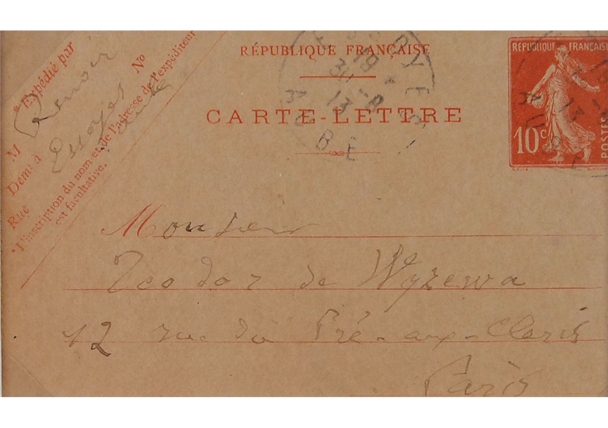 Hand-addressed and signed letter panel, postmarked 1913, addressed to his friend and art critic “[M]onsieur Teodor de Wyzewa,” in Paris, and signed in the upper left corner, “Renoir”, adding his street name underneath. Double-matted and framed with a color print of Renoir’s 1881 work ‘Luncheon of the Boating Party,’ featuring Gustave Caillebotte seated on lower right and Renoir's future wife Aline Charigot, to an overall size of 20 x 20. In fine condition, with Renoir’s writing and signature just a shade light, but all still completely legible.