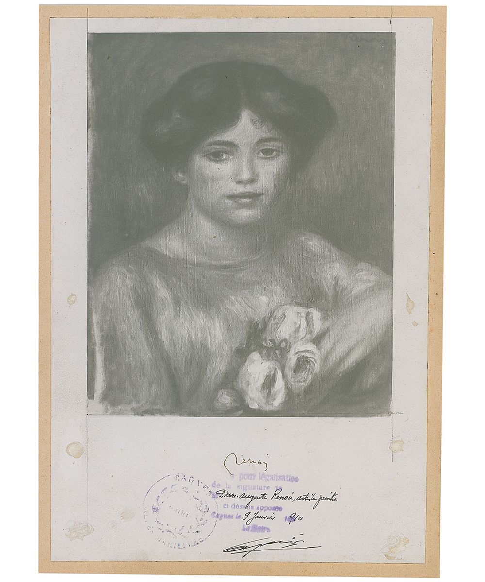 Vintage 7 x 10.25 photo of a reproduction of a Renoir, featuring a young woman holding flowers. The photograph is an authentication of one of his most attractive paintings. Signed in the bottom border in ink, “Renoir.” Also written in the bottom border by the Mayor of Cagnes, “Pierre-Auguste Renoir, artiste paintre, 9 Janrie, 1910,” signing below and adding the official stamp of city hall to authenticate Renoir’s signature. Image is affixed to a slightly larger cardstock mount. In very good condition, with some trivial rubbing, light ink borders around the image, adhesive remnants from previous mounting, and a few purple government stamps, one lightly affecting the signature. A rare opportunity to own an authentically signed Renoir at a fraction of what the painting would cost.