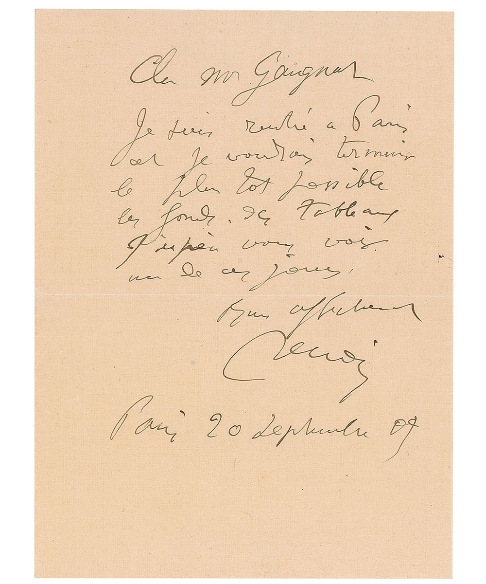 ALS in French, signed “Renoir,” one page, 4.5 x 6, September 20, 1904. Letter to his friend art collector Maurice Gaugnat. In full (translated): “I have returned to Paris and I would like to finish the backgrounds of the paintings as soon as possible. I hope to see you one of these days.” In fine condition. A crisply-penned letter with desirable art-related content.