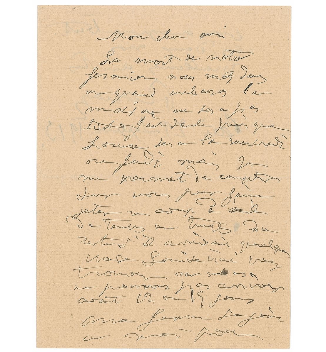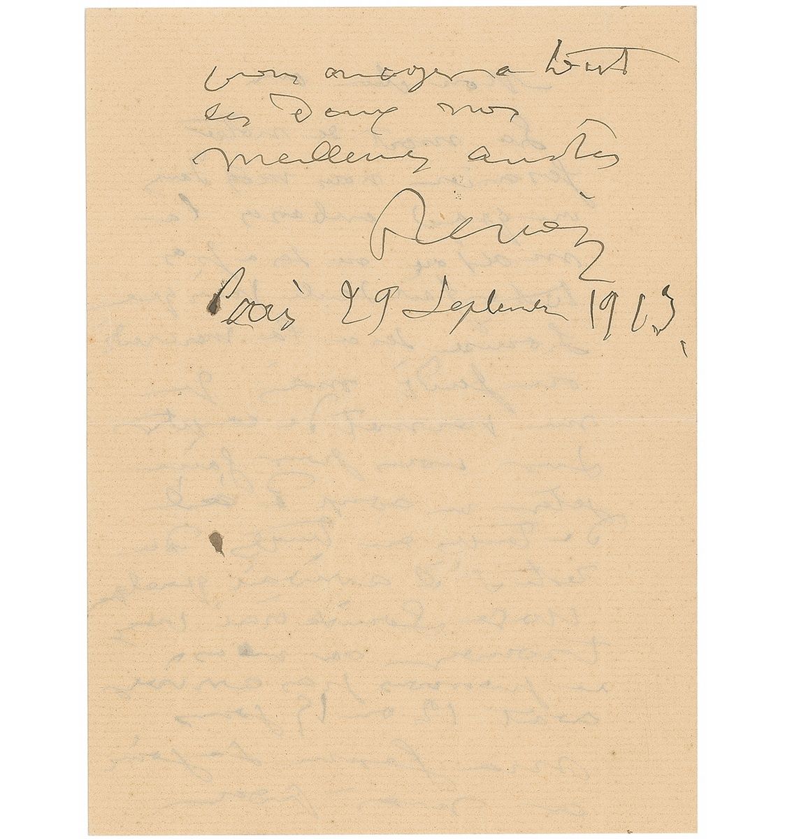 ALS in French, signed “Renoir,” one page both sides, 4.5 x 6, September 29, 1913. Renoir writes from Paris to a friend, requesting that he keep an eye on his house in Nice. In part (translated): “The death of our farmer puts us in great embarrassment. The house is not completely alone though Louise will be there Tuesday or Thursday but I used to count on you to take a look from time to time.” In fine condition. The aging Renoir had moved to a farm at Cagnes-sur-Mer, a suburb of Nice, in 1907 so that he could be in a warmer climate close to the Mediterranean coast.