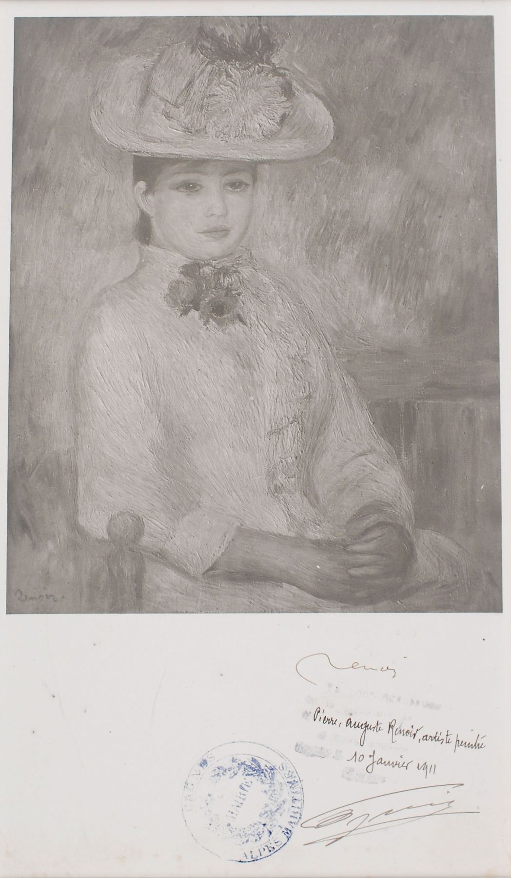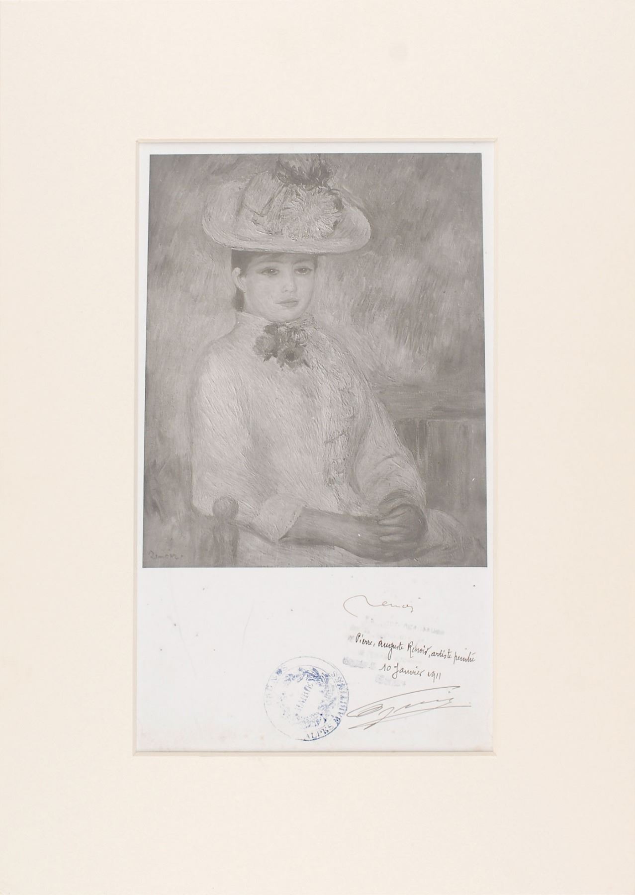 Exquisite matte-finish 6.25 x 10.5 photographic print of Renoir’s 1885 painting entitled ‘Girl in the Yellow Hat,’ signed in the lower border black ink, “Renoir.” Lower border also bears official certification stamps in French signed by the mayor of Cagnes-sur-Mer, to authenticate Renoir’s signature, adding the date of January 10, 1911. Matted to an overall size of 11 x 15.5. Some scattered surface marks and mild foxing to the lower border, otherwise fine condition. A nice example of one of the Impressionist’s portraits.