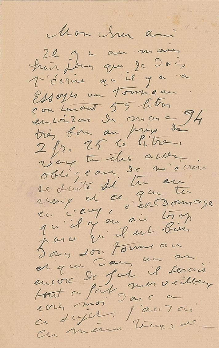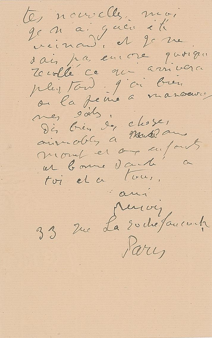 Fantastic ALS in French, signed “Renoir,” two pages on two adjoining sheets, 4.25 x 7, no date. Rare letter to fellow painter Claude Monet, in part (translated): "There has been at least eight days that I was meaning to write to you that in Essoyes there is a barrel that contains 55 litres of a 94 brandy that is a particularly good mark of a great quality for the price of 2 francs 25 for each litre. Can you be so kind to write me immediately if you want some and how much. It is a pity that there are too many liters because it is very comfortable in its barrel and in one more year it will be absolutely marvelous. Please write to me on this. I will also have your news. I have not been very lucky of late. Although I’ve been restored I don’t know what will happen next. I have a lot of trouble to maneuver what seems like my fingers. Please tell everything that is kind to Mrs. Monet and to your kids and good health to you and for all." In fine condition. A fascinating letter in all respects—it is one of few letters from Renoir to Monet on the market; it discusses a fine brandy; and it alludes Renoir's arthritis, which plagued him for the last 25 years of his life and forced him to develop new techniques for holding his paintbrush.