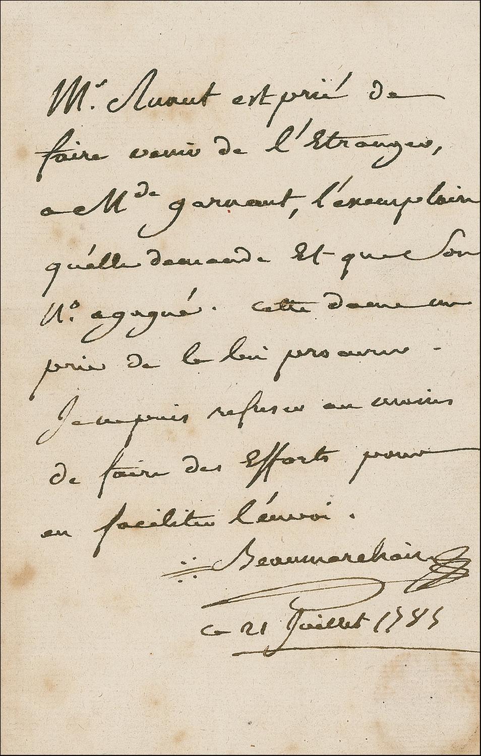 Watchmaker, inventor, musician, diplomat, fugitive, spy, publisher, arms dealer, and revolutionary (1732–1799) best known for his theatrical works, especially the three Figaro plays. ALS signed “Beaumarchais,” one page, 4.25 x 6.5, July 21, 1785. In French, Beaumarchais responds to a book dealer in Paris. In full (translated): “M. Ruot is requesting to send from abroad to Mme. Garnant the copy [of a book] that she is requesting and that her number has won. This lady is asking me to procure it for her. I cannot refuse, at least, to make an effort [to do my best] to facilitate the sending [of it].” In very good condition, with mailing folds, toning, soiling, and show-through from residue of the wax seal on the reverse side.