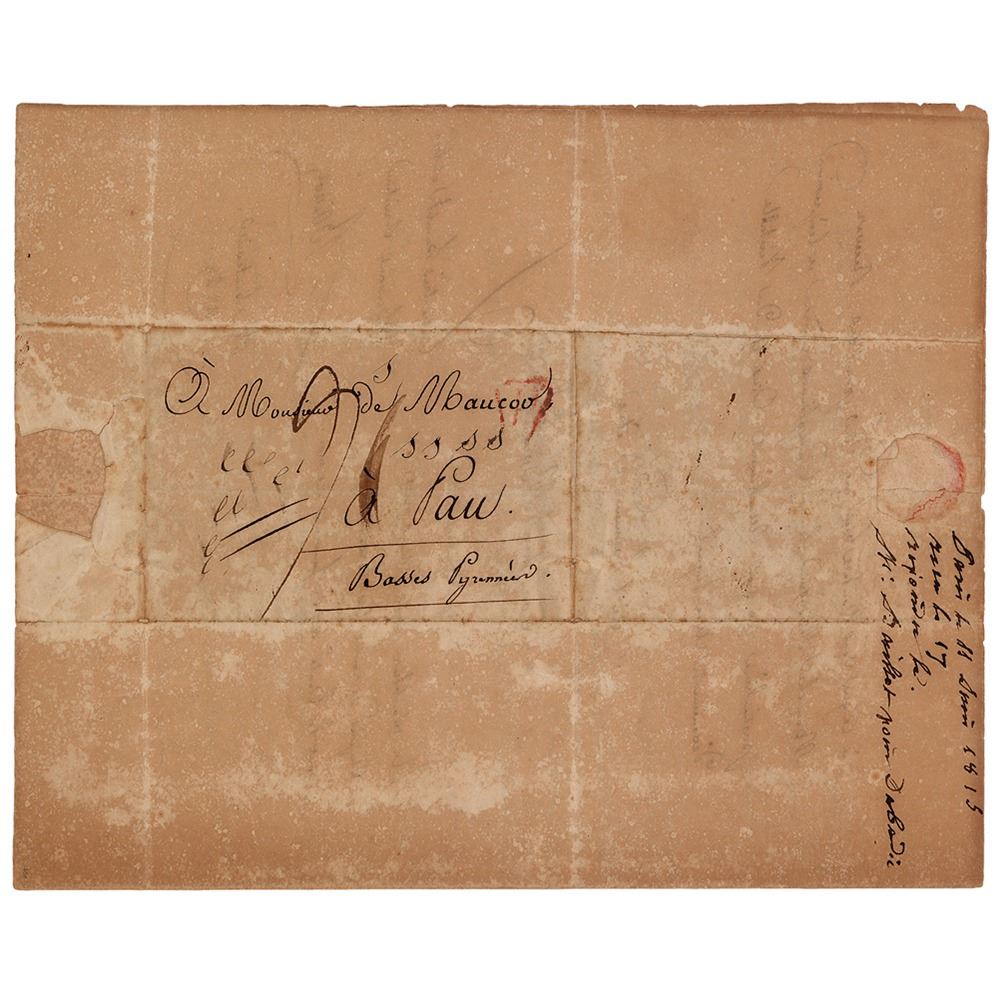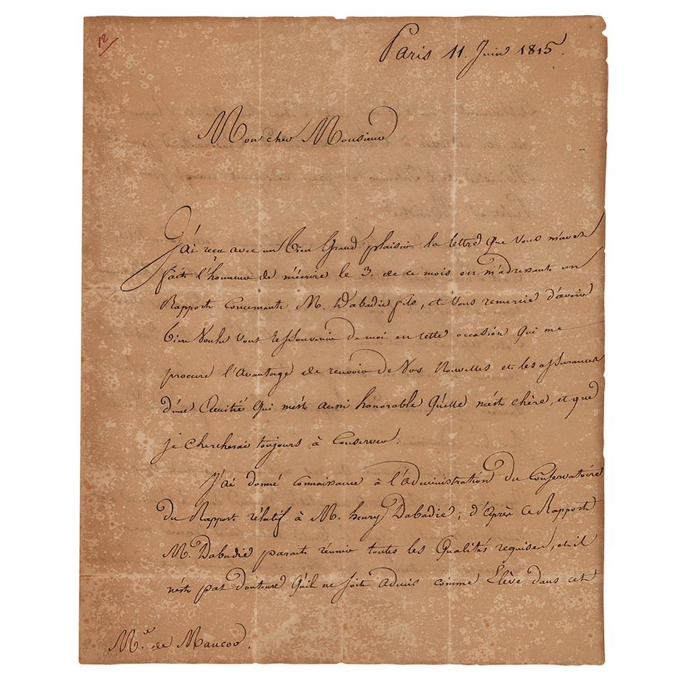 Scarce LS signed “Baillot,†three pages on two adjoining sheets, 7.5 x 9, June 11, 1815. An untranslated letter from Pierre Baillot, who signs with a wonderful paraph that incorporates his home address and a small sketch of a roadway. In very good condition, with overall foxing and mottled toning, and seal-related paper loss to the bottom edge.